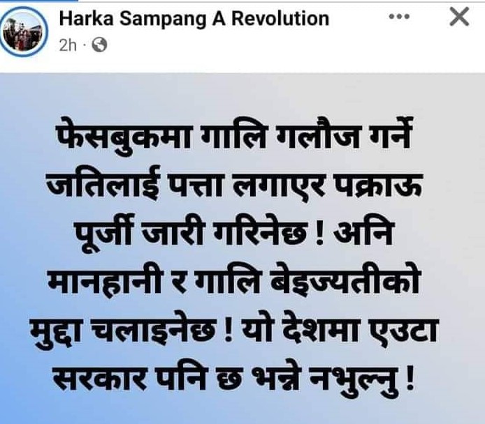 इटहरीः धरान उपमहानगरपालिकाका मेयर हर्क साम्पाङले सामाजिक सञ्जाल फेसबुकमा गाली गर्नेलाई पक्राउ पुर्जी जारी गरी जेल हाल्ने चेतावनी दिएका छन् ।