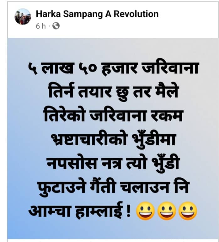 सामाजिक सञ्जाल फेसबुकमा स्टाटस लेख्दै उनले आफू साढे पाँच लाख जरिवाना तिर्न तयार रहेपनि सो रकम भ्रष्टाचारीको पेटमा परे आफू गैँती चलाएर पेट फुटाउन सक्षम रहेको भनी व्यङ्ग्यात्मक रुपमा रकम दुरुपयोग नगर्न चेतावनी दिएका हुन् । सामाजिक सञ्जालमा उनले लेखेका छन्, ‘५लाख ५० हजार जरिवाना तिर्न तयार छु तर मैले तिरेको जरिवाना रकम भ्रष्टाचारीको भुँडीमा नपसोस् नत्र त्यो भुँडी फुटाउने गैती चलाउन नि आम्च हाम्लाई !’