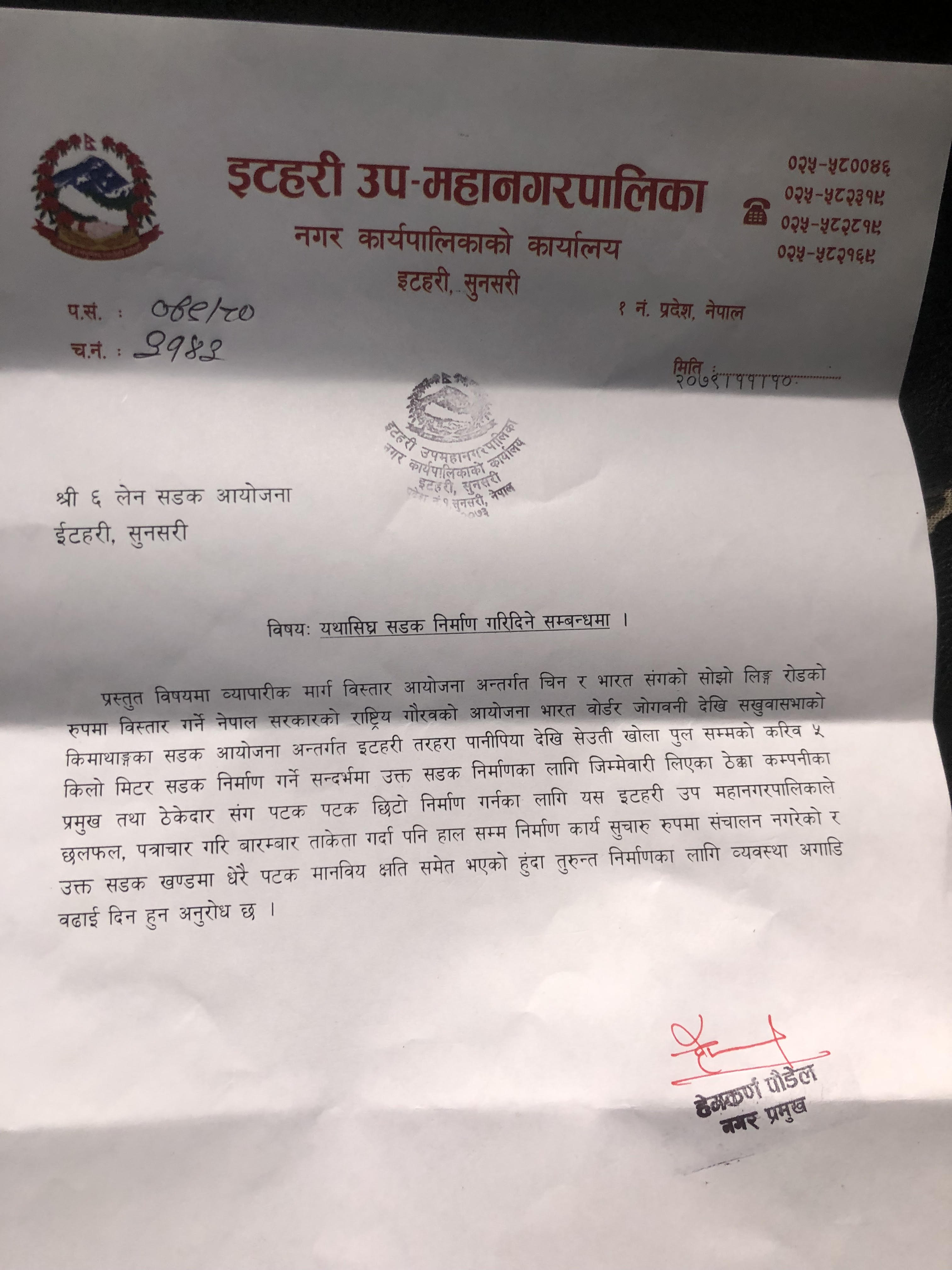 इटहरीः इटहरी उपमहानगरपालिकाले तरहराको पानीपिया देखि सेउतीसम्मको बाटो छिटो निर्माण गर्न आयोजना प्रमुखलाई पत्रचार गरेको छ ।